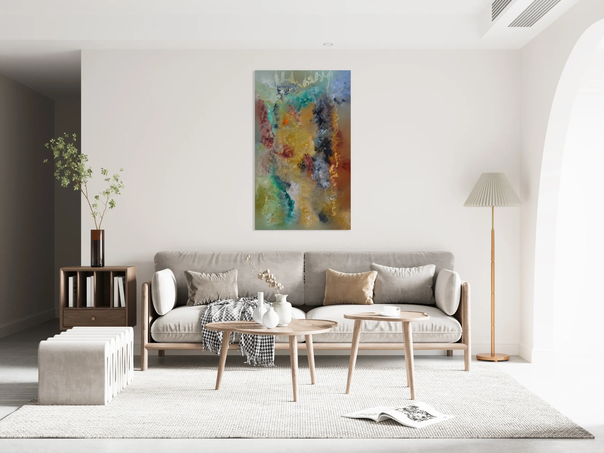 Description of the Abstract Painting: This abstract painting titled "Hide & Seek" is an intriguing piece of modern abstract art, perfect for those who enjoy abstract paintings that invite exploration and personal interpretation. The composition features a rich palette of deep greens, golden ochres, warm browns, and touches of vivid red, creating a visually striking contrast with depth. The design incorporates overlapping textures and forms that seem to emerge and recede, evoking a sense of play between the visible and the hidden, reflecting the title. The green and brown tones suggest organic and natural elements, while the red accents provide a focal point that energizes the composition. Ideal for lovers of modern abstract art, this piece invites viewers to immerse themselves in its abstract details and forms, exploring its visual layers and the emotions it evokes. It’s a versatile work that can bring mystery and depth to any space or collection.