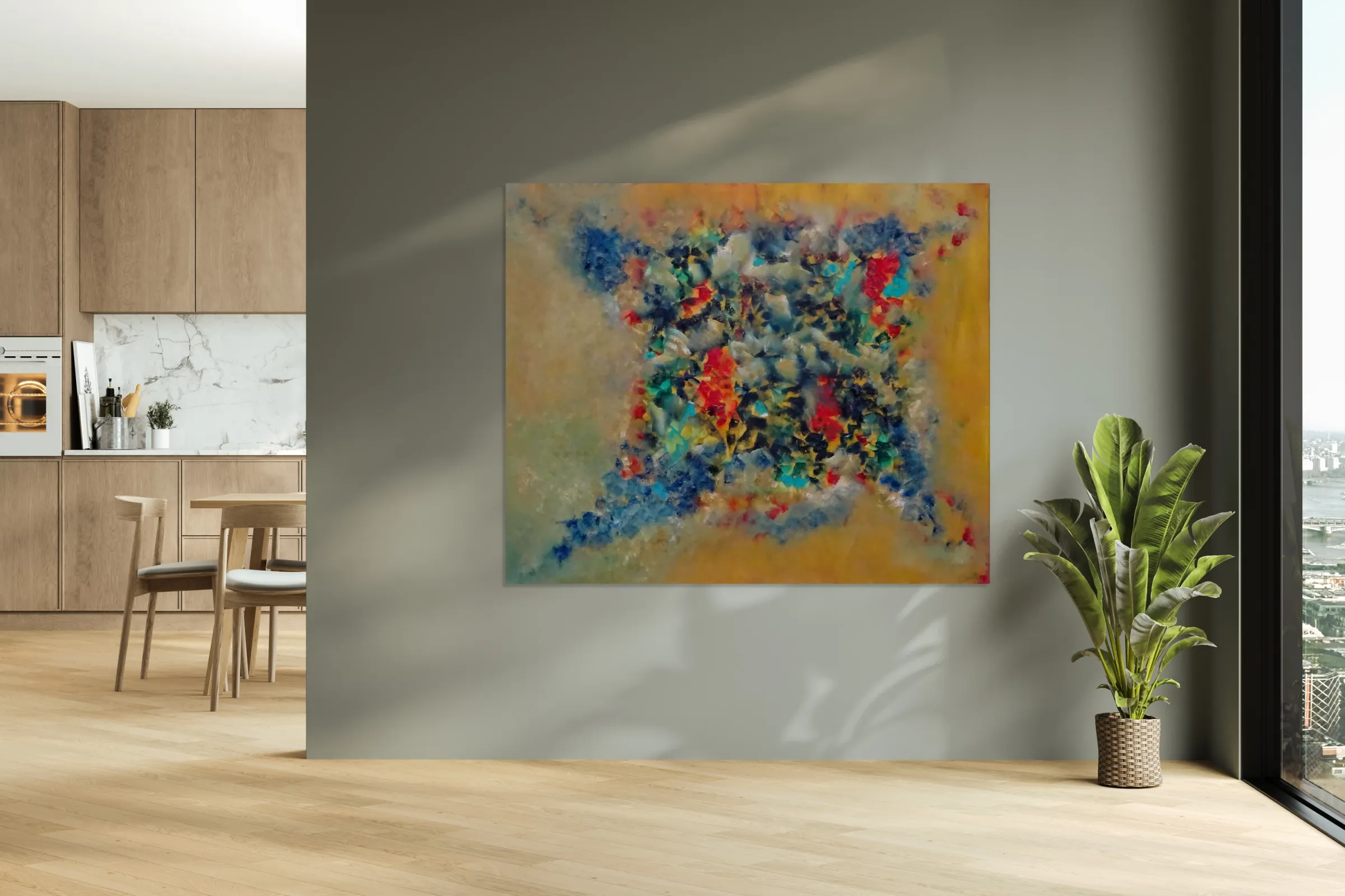 Description of the Abstract Painting: This abstract painting titled "Ricochet" is an outstanding piece of modern abstract art, ideal for those who appreciate abstract paintings that blend energy and complexity. The vibrant composition features a rich palette of deep blues, bold reds, lush greens, and earthy ochres, balanced by a soft beige background that enhances the overall depth and structure. The central focus of the artwork is a dynamic interplay of textures and colors, where vivid elements radiate outward, creating a sense of movement and rhythm. The layering of bold tones like red and green, contrasted with the blue and ochre, offers a visual dialogue between vibrancy and subtlety. Perfect for lovers of modern abstract art, this painting captures the essence of energy, motion, and balance, making it an inspiring addition to any space. Its bold yet harmonious composition invites viewers to immerse themselves in its intricate details and create their own interpretation.