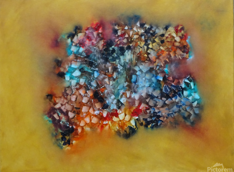 Description of the Abstract Painting: "Inmixión" is an abstract painting that truly captivates with its blend of fragmented geometric shapes and a vibrant, contrasting color palette. This artwork invites you into an immersive visual journey, where the central shapes appear to float against a warm, diffused background of yellow hues. Layered textures and gestural brushstrokes at the center create a sense of depth and movement, while the fragmented geometric shapes are arranged to evoke a feeling of simultaneous construction and deconstruction, prompting reflections on identity and otherness. The warm-toned background softens the transition between the shapes and the surrounding space, allowing your eye to glide freely across the piece. The interplay of cool and warm colors introduces a visual tension characteristic of pinturas abstractas, encouraging thoughtful contemplation. This cuadro abstracto is perfect for those who seek a balance of dynamism and tranquility in their art. It's an excellent choice for anyone looking to disfrutar arte abstracto moderno in their home or office, adding a touch of sophistication and intrigue to any space.