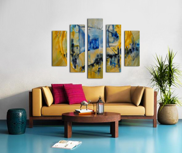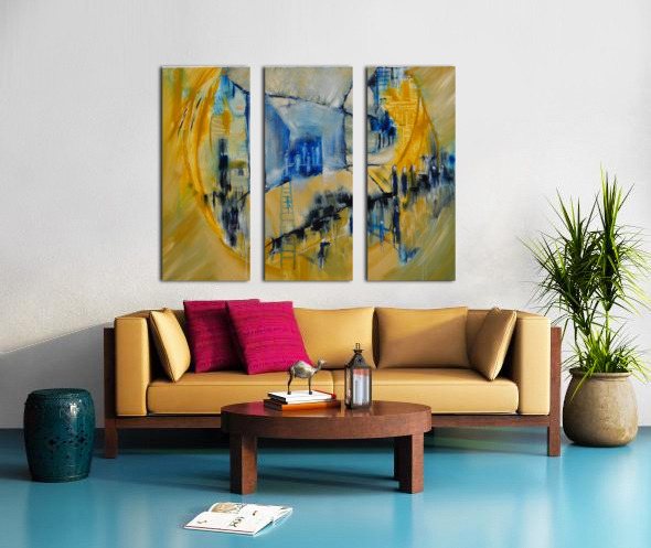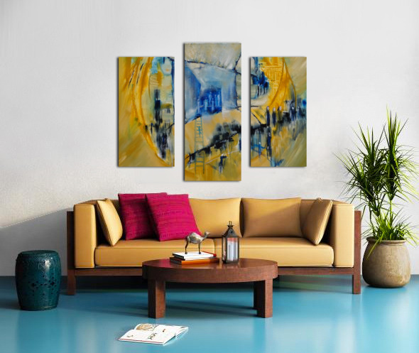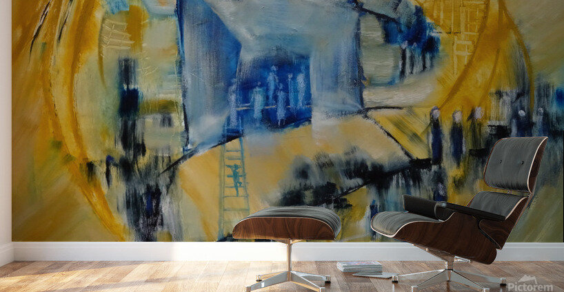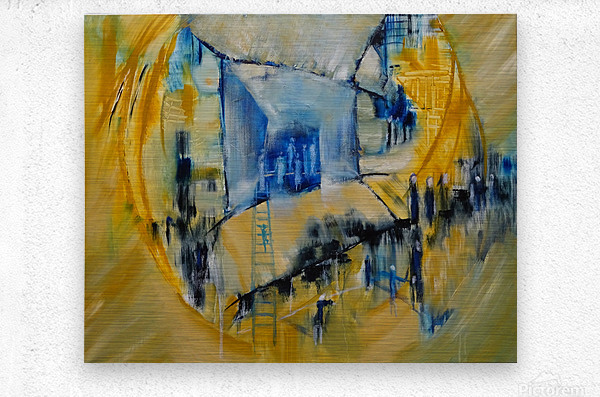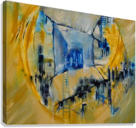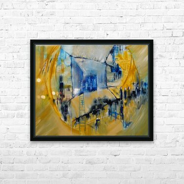 Description of the Abstract Painting: This abstract painting titled "You Found It" is a fascinating piece of modern abstract art, combining figurative elements with geometric forms and a vibrant palette. The composition is dominated by golden yellows, deep blues, and shades of ochre and cream, creating a dynamic and engaging contrast. The design incorporates subtle figurative elements, suggested by shapes resembling ladders and architectural structures. These figures emerge from the abstract background, blending seamlessly with curved lines and soft brushstrokes, creating an interplay between the figurative and the abstract. This balance evokes a visual narrative of exploration and discovery. The warm yellow tones bring energy and vitality, while the deep blues provide a sense of stability and introspection. This combination invites viewers to interpret the figures and their interaction with the surrounding abstract environment. Perfect for lovers of modern abstract art, this piece stands out for its ability to merge figurative forms with pure abstraction, making it a work that captures both the imagination and intellect. It is an ideal addition to any collection or space seeking inspiration and visual depth.