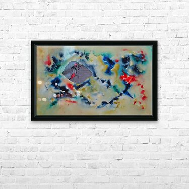 Description of the Abstract Painting: This abstract painting titled "Tango III" is a captivating piece of modern abstract art that seamlessly blends figurative elements with a dynamic and expressive background. The composition features a vibrant palette of deep blues, intense reds, emerald greens, and warm ochre tones, integrated into fluid and energetic forms. At the center of the piece, a minimalist figure represents a couple dancing tango. The simple strokes and the red dress of the dancer capture the passion and emotional connection of the dance, contrasting beautifully with the abstract surroundings filled with movement and vitality. Perfect for lovers of modern abstract art, "Tango III" celebrates the energy and intimacy of tango without the need for defined frames or boundaries within the composition. It’s a piece that adds dynamism and depth to any space or collection.